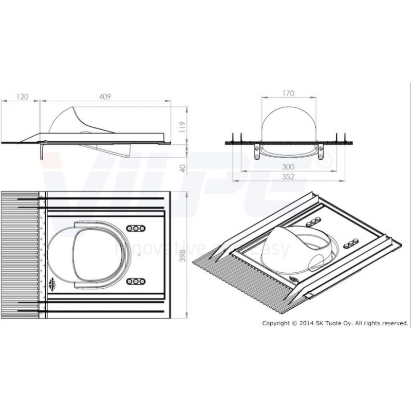 Pielietojums: Visiem dakstiņu jumtiem (keramikas, māla, betona un citiem dakstiņiem, 1- un 2-viļņu dakstiņiem, kā arī plakanajiem dakstiņiem).Komplektā: Pieslēguma elements, augšējās kantes blīvējuma komplekts, apakšas stiprinājumi, hidroizolācijas gredzens, atloks, vāks, termonosēdošais blīvslēgs, skrūves, uzstādīšanas instrukcija un šabloni.