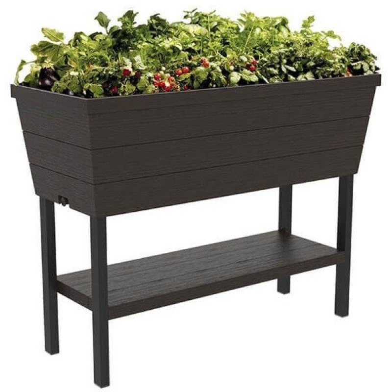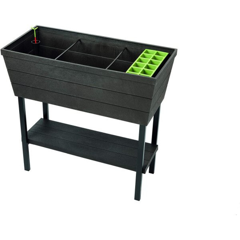 Pārdomāts puķu poda dizains ar iebūvētu apūdeņošanas sistēmu padara augu kultivēšanu par patiešām lielu prieku. Ūdens līmeņa indikators ļaus izvairīties no pārmērīgas hidratācijas un iekļautie mazie trauki atvieglo stādu organizēšanu. Papildu priekšrocība ir plaukts uz kura var novietot nepieciešamos dārzkopības piederumus vai mazākus podus.