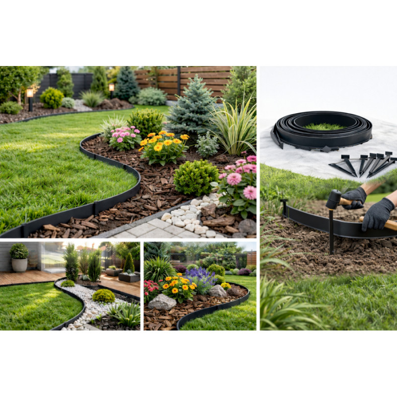 Ideāli piemērota zāliena atdalīšanai no dobēm šķembām vai dekoratīvajiem akmeņiem.