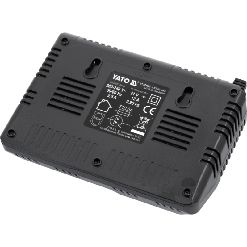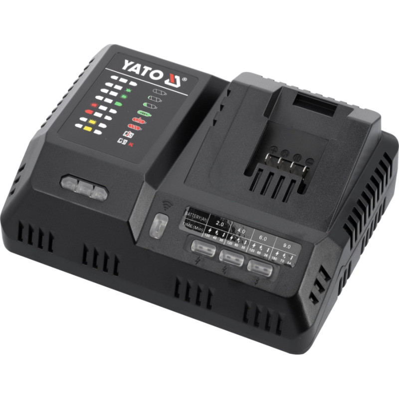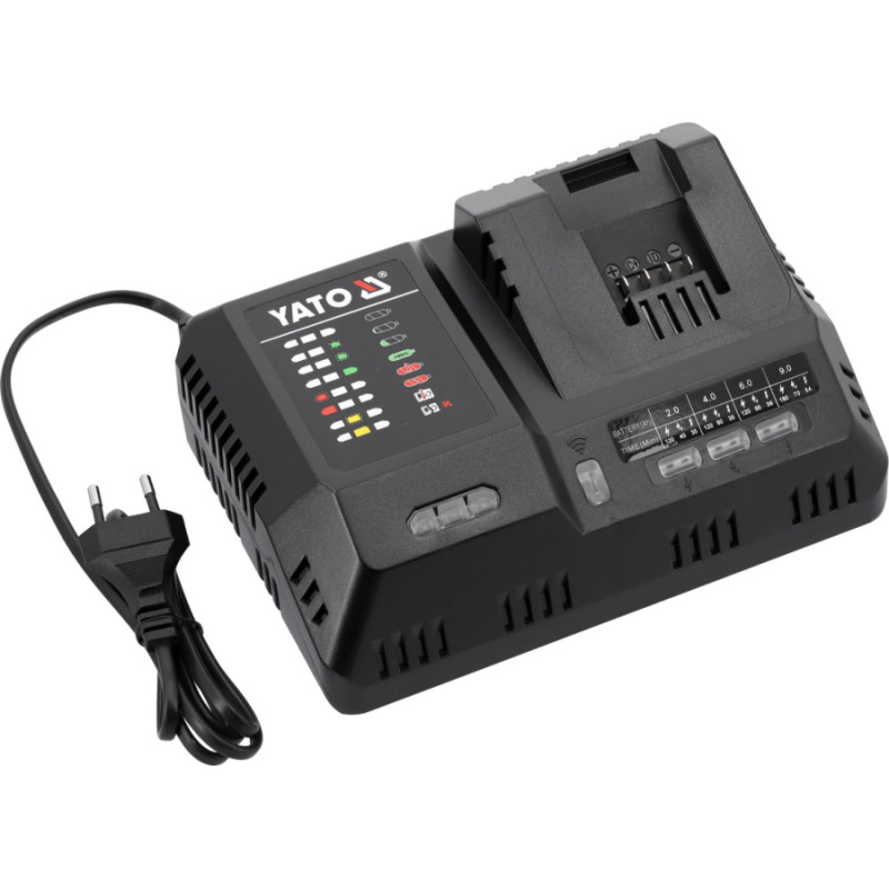Tirgū ātrākais lādētājs 18 V YATO litija jonu akumulatoriem. Ierīce nosaka pievienotā akumulatora veidu un uzlādē to ar maksimālo drošo strāvu, ko akumulators spēj pieņemt, dozējot strāvu diapazonā no 2A līdz 12A. Lādētājs ir aprīkots ar ventilatoru, kas uzlādes laikā atdzesē šūnas.