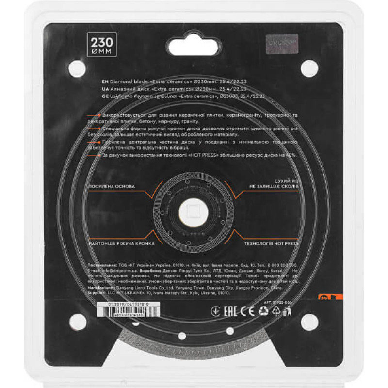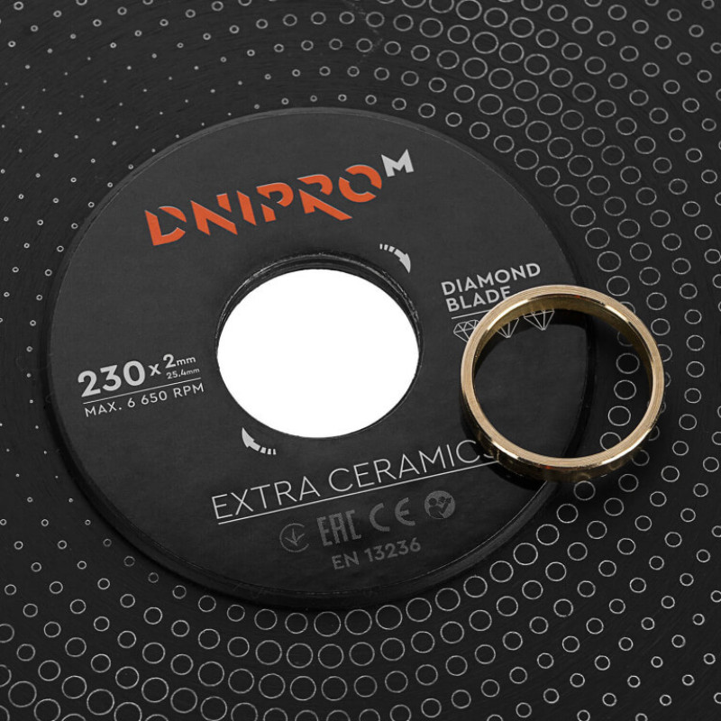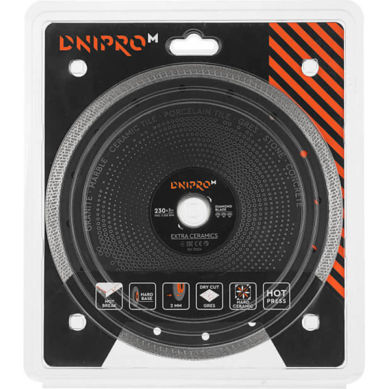 Dimanta asmens Dnipro-M Extra-Ceramics 230 25.4 / 22.2 mm ļauj veikt tīrus dažādu materiālu griezumus: porcelāna keramikas, keramikas flīzes, granīta, marmora un dekoratīvās flīzes.