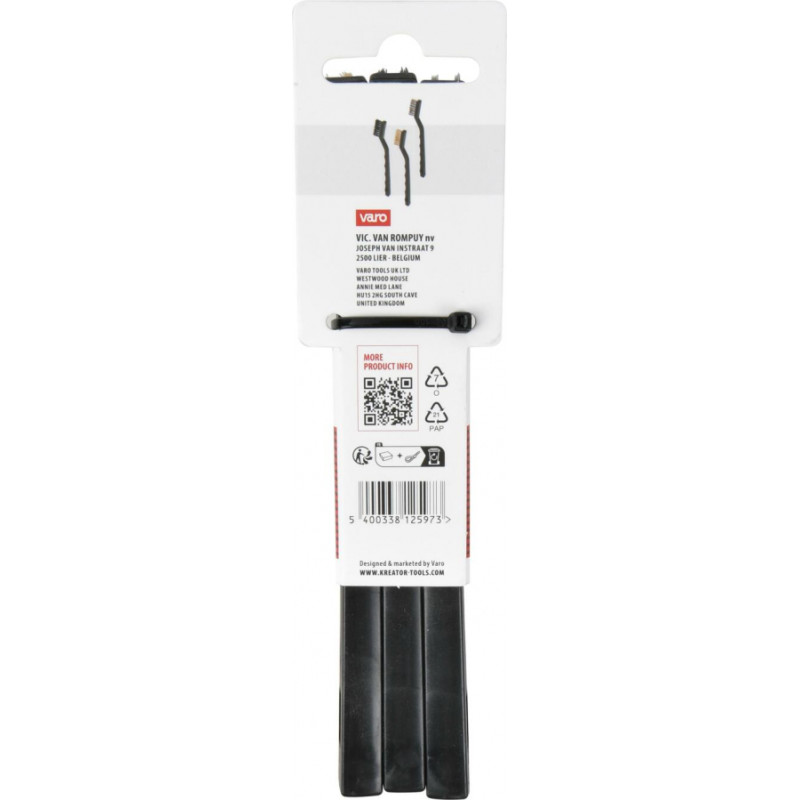 Šis komplekts satur 3 mini metāla birstes ar dažādu veidu saru: nerūsējošā tērauda, varu un neilona. Tās ir piemērotas dažādiem darbiem, piemēram, rūsas un netīrumu tīrīšanai vai instrumentu uzturēšanai. Antislīdošā rokturis nodrošina drošu satveri.