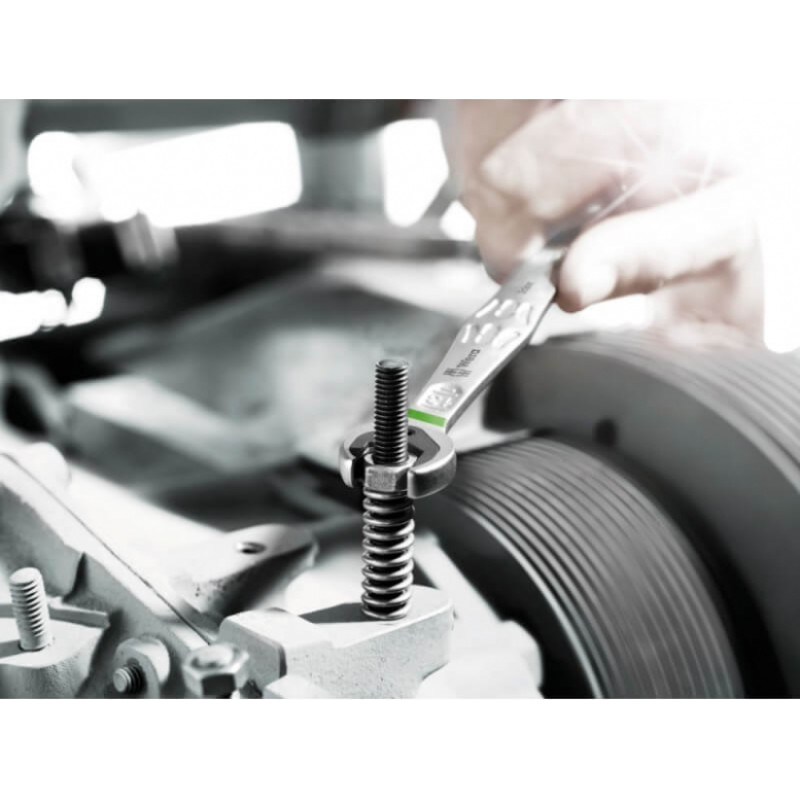 Kombinētā uzgriežņu atslēga. Unikāla turēšanas funkcija – samazina skrūves vai uzgriežņa izmešanas iespējamību. Divkāršā seškantes ģeometrija samazina noslīdēšanas iespējamību. Tirkšķatslēga ar 80 zobiem – ērti strādāt šaurās vietās.