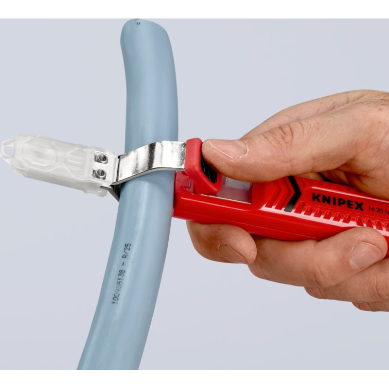 Įvairių kabelių nuizoliavimui. Užsispaudžianti laikymo svirtis. Reguliuojamas pjovimo gylis. Pasukama geležtė apskritam ir išilginiam pjovimui. Atsarginis peilis rankenoje. Saugi neslystanti rankena. Korpusas - plastikinis, atsparus smūgiams.