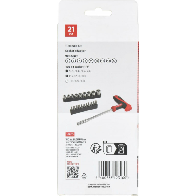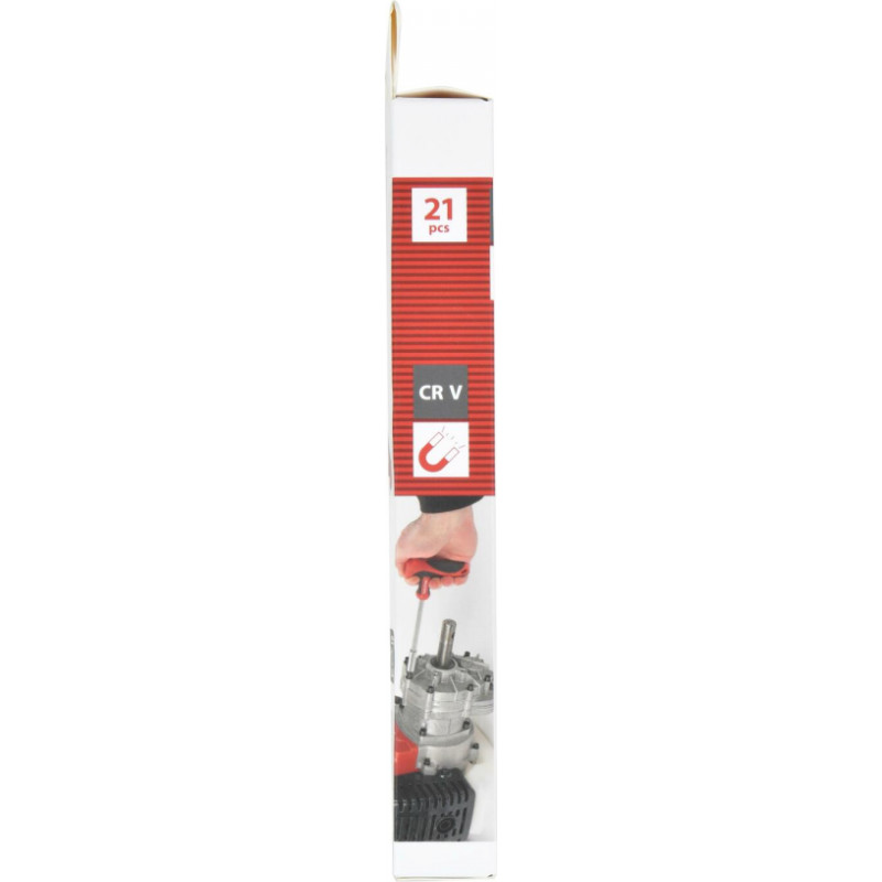 This is a 21 #-piece socket wrench and screw bit set from our Kreator line. Use the practical, T-shaped screwdriver with bit holder for any project involving screws. The soft anti-slip handle provides a firm grip. The set also contains an extensive selection of screw bits and socket wrenches.