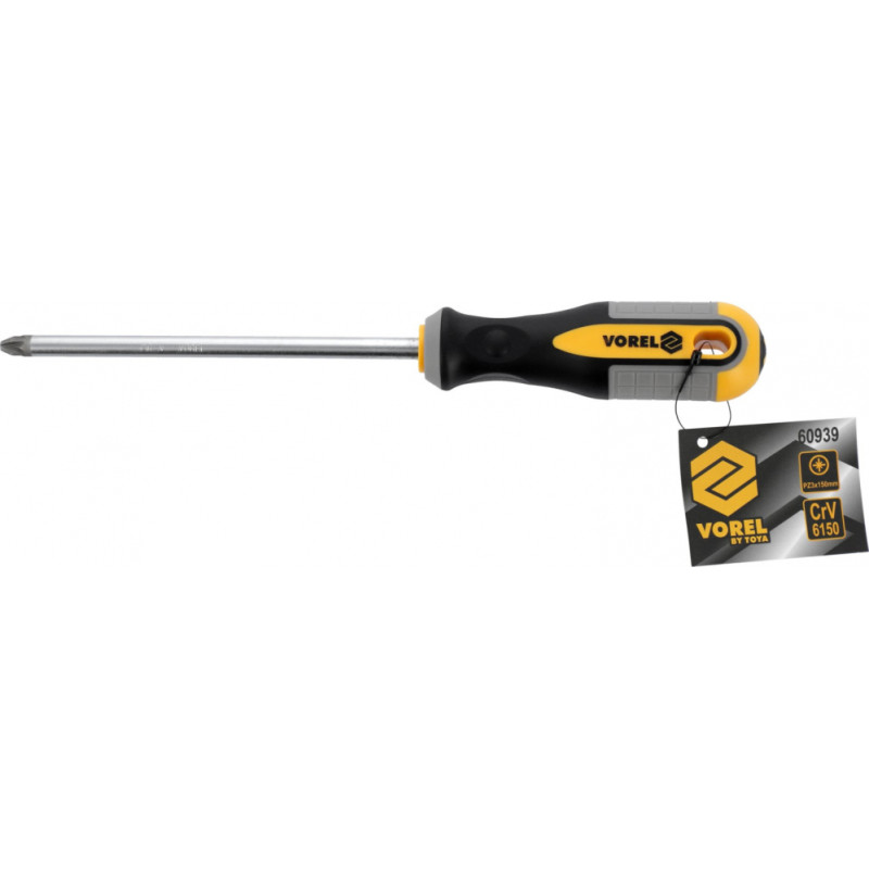 Teutoniskais skrūvgriezis PZ3X150 mm no Vorel 60939. Izgatavots no CRV hroma-vanādija tērauda. Galva ir ar satīna apdari, papildus smilšstrūklota un namagnetizēta, kas nodrošina drošu skrūves turēšanu. Rokturi veidoti no divām kompozītmateriālu plastmasām. Roktura caurums ļauj skrūvgriezi pakārt. Indekss: 60939