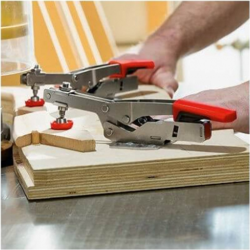 Metāla, koka, plastmasas saspiešanai. Horizontālās sviras spīles ar atvērtu rokturi un horizontālu pamata plāksnīti. Aizspiestā pozīcijā rokturis ir horizontāls. Automātiska un neierobežota saspiešanas augstuma regulēšana līdz 35 mm. SB iepakojums.