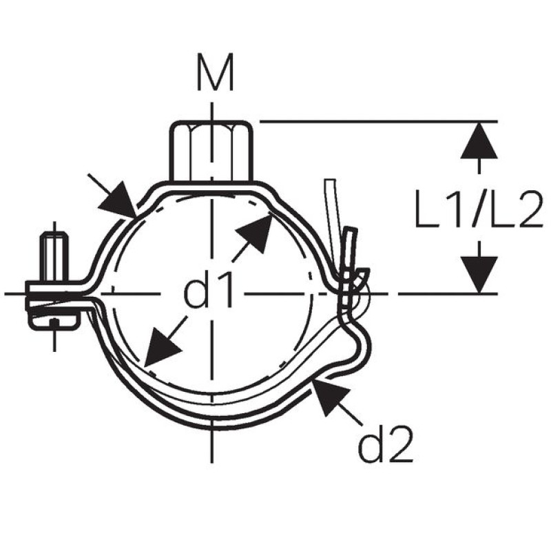 Caurules stiprināšanas skava ar vītnes ligzdu M10, cinkota un regulājama. Caurules stiprināšanai pie sienas un griestiem.
